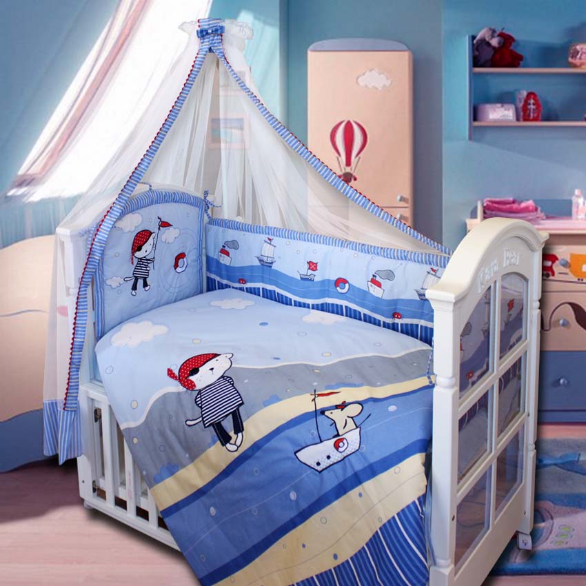бампера раздельного, украшенного рисунками с изображением моря с кораблями и большой аппликацией в виде котика моряка с сачком и спасательным кругом;