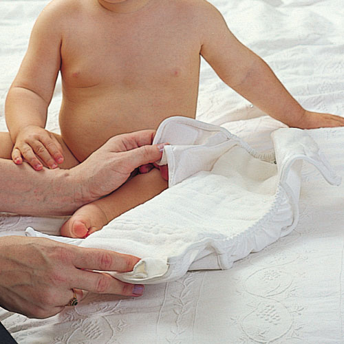 Сложите вкладыш-подгузник в три раза, обверните его сверху впитывающей салфеткой. Поместите все это на трусики.