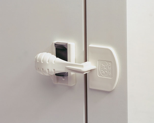 Удалите защитный слой с поверхности двухсторонней клейкой ленты. Приклейте детали клейкой ленты на плоскости блокировки, предназначенные для крепления. Приклейте блокировку на подготовленное место там, где она будет недоступна для малыша.