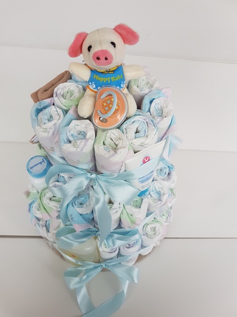 упаковка подгузников Violetta, упаковка влажных салфеток Violetta, пустышка, присыпка детская Johnson's Baby, шампунь Johnson's Baby, крем Johnson's Baby, носочки для новорожденных, игрушка.