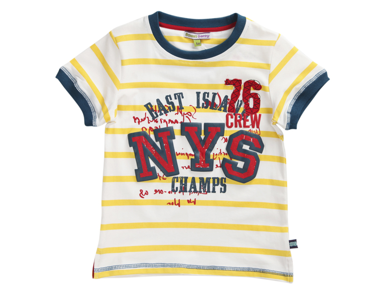 - Футболка декорирована красивым принтом и аппликацией, так же футболку украшают отделочные строчки.